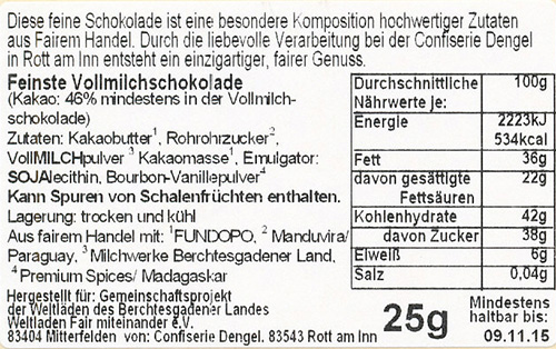 Mit dieser edlen Vollmilchschokolade, verfeinert mit Carabao-Mangos aus dem Fair-Handelsprojekt Preda/Philippinen, fairem Zucker aus Mauritius und Edelkakao aus Kolumbien bieten Ihnen die Weltläden im BGL einen Genuss der besonderen Art zum Genießen, Helfen und Fair-Schenken.