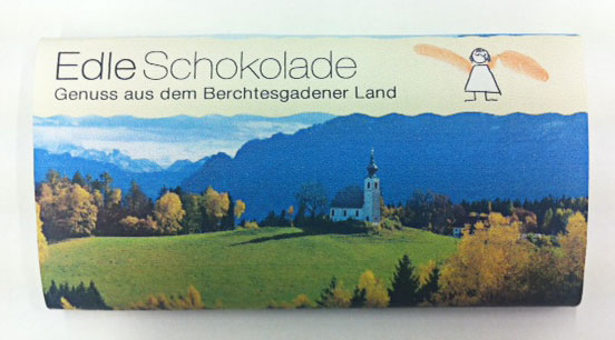 Auf der Vorderseite der Banderole sehen Sie unsere wunderschöne bayerische Heimat, innen erwartet sie eine wahrhaft köstliche Schokolade.